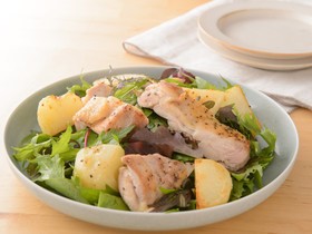 お皿にベビーリーフを盛り、1㎝幅に切った鶏肉とじゃがいもを載せてドレッシングをかけて完成です。
