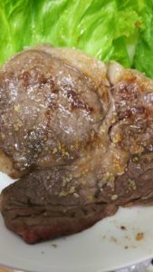 ステーキ用の肉に塩コショウとガーリックパウダーをかけ、フライパンに牛脂を入れて加熱し、お肉を両面焼いて蒸し焼きにしたら完成です。
