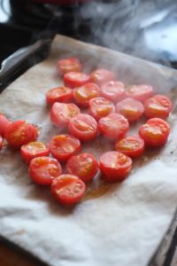 ただし、オーブンの場合は温度を調整できるので、低温でじっくりと焼くとトマトがとろーっと溶けるくらいやわらかくなりますし、逆に高温で短時間焼くと食感を残すことができます。