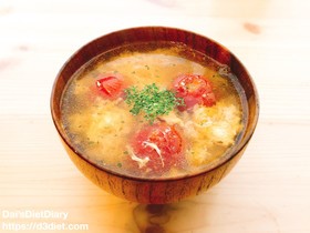 鍋に水とだしの素、オイルごとトマトを入れて、沸騰したら弱火にし、味噌、溶き卵を入れて、最後にパセリを散らして完成です。