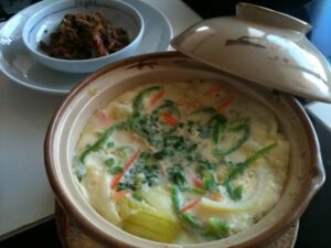 食事の順番の理想は、食物繊維が多くカロリーの低い野菜が一番目がよいと言われているので、まずはサラダ(または味噌汁に入っている海藻)を食べ、その次に茶わん蒸しを食べるのが順番としてはお勧めです。