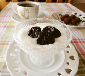 器にヨーグルトを入れ、プルーンを添えて蜂蜜をかけて完成です。