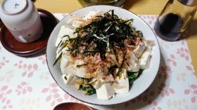 ご飯の上に、茹でて水切りしてカットしたほうれん草、刻んだ白ねぎ、ツナ缶(汁ごと)、醤油をかけ、その上に適当な大きさに切ってザルにあけておいた豆腐を乗せ、さらに刻みのり、鰹節をトッピングして完成です。
