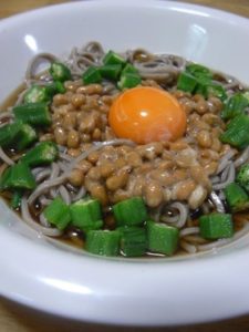 器にそば、カットしたオクラ、混ぜた納豆(タレを入れる)を乗せ、めんつゆと水を合わせてかけたら完成です。