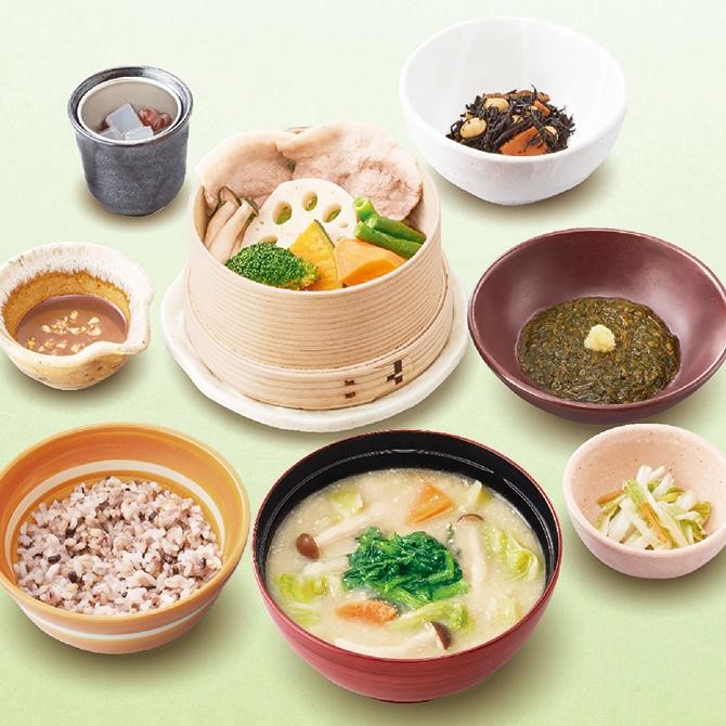 野菜のせいろ蒸しとたっぷり野菜の麦みそ汁定食488㎉、沖目鯛の醤油麹漬け炭火焼き定食560㎉など、品数の多い定食メニューの中でも500㎉前後のメニューがあります。