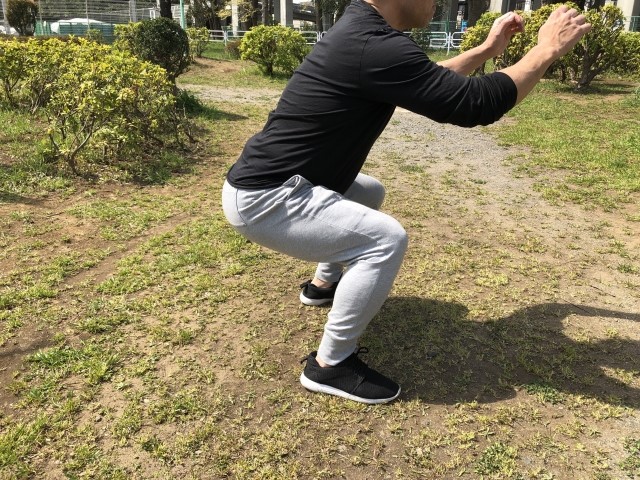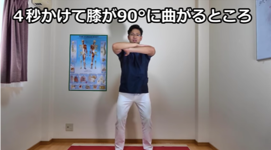 4秒かけて膝が90°になるところまでしゃがんでいきます。