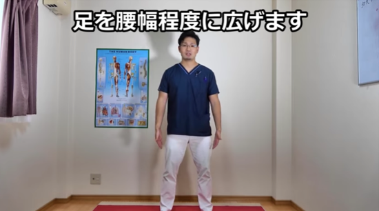 まず足を腰幅程度に開き、つま先をやや外側を向けて立ちます。