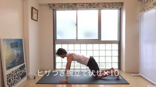 両手の間に胸を降ろすような意識で腕立て伏せを10回行いましょう。