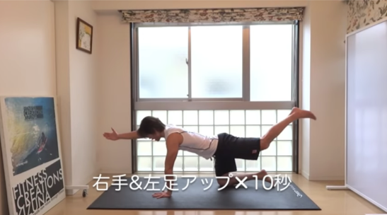 右腕と左足を挙げて10秒間バランスをとっていきます。