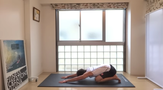 キープが終わったら両膝を床につけ、お尻を後ろに下げて背中のストレッチを行って終了です。