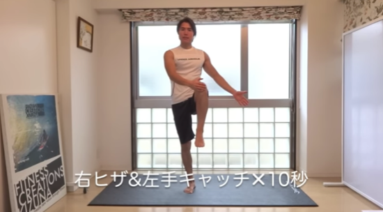 左手で右の膝を掴んで左足一本で10秒間バランスをとります。