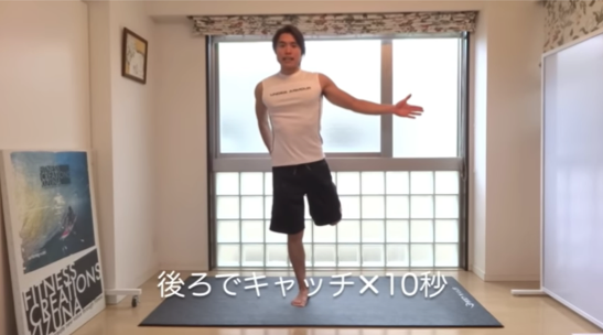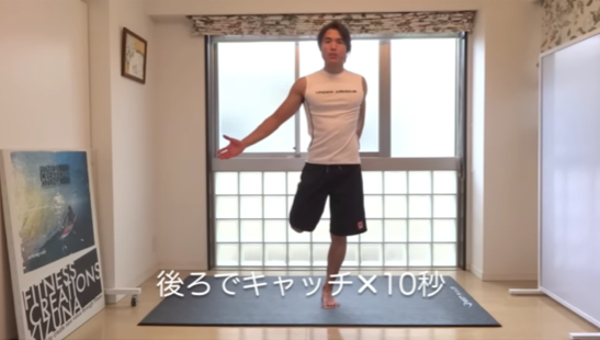 10秒キープが終わったら、右足でバランスをとりながら体の後ろで足をキャッチします。