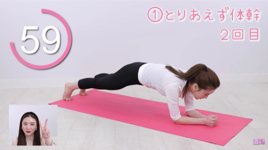 動画で用意するものについては特に触れていませんが、「ひよん」さんは裸足で運動できる服装とヨガマット1枚で筋トレを行っています。