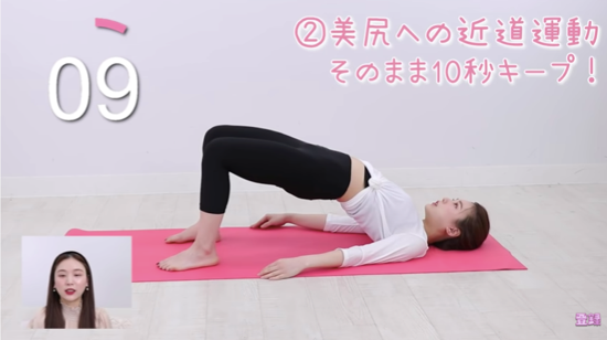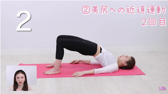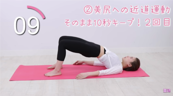 仰向けで膝を曲げてお尻の上げ下げを20回と、20回目でお尻を上げたまま10秒キープします。
