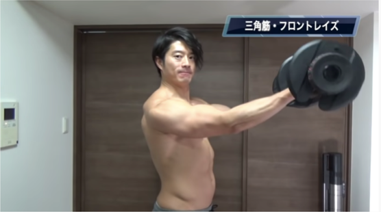 サイドレイズは真横に上げましたが、フロントレイズは前にダンベルを上げます。
