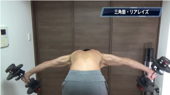 体幹をかなり前傾させ、ダンベルを真横に上げます。
