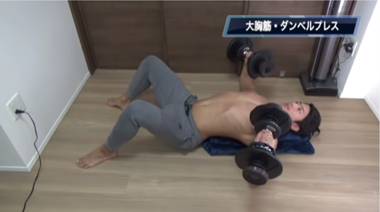 そうすることで、ダンベルを下げた時に肘が床につかずに可動域を大きくして行うことができるので、胸の筋肉に効きやすくなります。