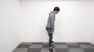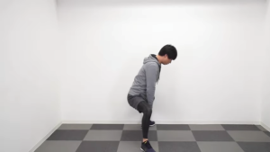 このスタートポジションを保ったまましゃがんで下で2秒キープし、立ち上がります。