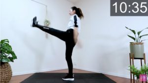 次はスクワットで立ち上がったときに足を真横に上げます!