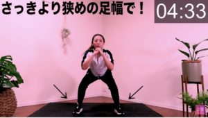 やり方は先ほどと同じですが、下半身がかなり疲労して下までしゃがむのが大変だと思いますが、ここで頑張れるとトレーニングの効果が十分に高くなるので、しっかり下までしゃがんでいきましょう!