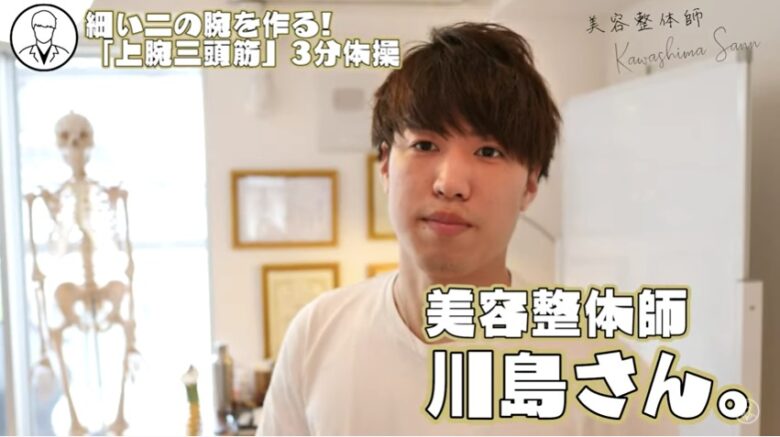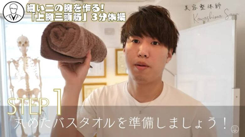 『【1週間で-3cm!!】二の腕を細くする方法 【 トレーニング 】【 二の腕痩せ 】【美容整体師 川島さん。】』は約6分程度の動画で、二の腕痩せに効くタオルを使ったトレーニングを紹介しています!