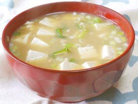 鍋に水を入れて火にかけたら、粉末だしとさいの目にカットした豆腐、みじん切りにした長ねぎを入れます。