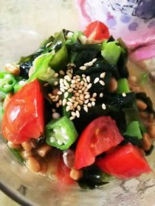 納豆にオクラとトマト、水を絞ったわかめを合わせて混ぜ、器に盛った後ごまを振って完成です。