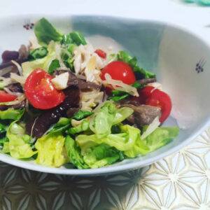 水で戻して大きめにカットしたきくらげ、半分にカットしたミニトマト、洗ってちぎったサラダ菜、焼いてほぐしたささみ、茹でて水気を切ったもやしと、叩いて潰した梅、ちぎったモッツァレラチーズ、調味料を混ぜて完成です。