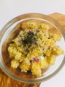 茹でたキヌアとみじん切りにして20分塩と水につけておいた玉ねぎに、小さくカットしたマンゴーとパイナップルを合わせ、塩とミントを混ぜたらオリーブオイルを入れて完成です。