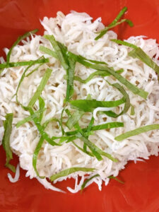 麦ご飯の上に海苔を散らし、しらすと細かく切った大葉を合わせます。