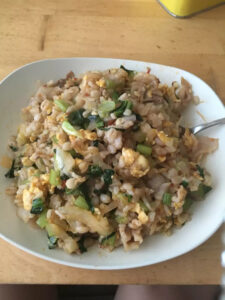 野菜と卵と肉を炒めたら麦ご飯を入れてさらに炒め、鶏がらスープの素と豆板醤で味付けして完成です。