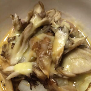 玉ねぎの上にチーズ、ちぎった舞茸、チーズを重ねて、再び1分加熱したら醤油をかけて完成です。