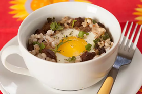 パセリを入れて炒めたら、耐熱皿に入れ、卵を落とします。