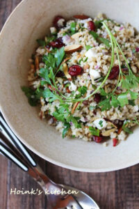 冷ました穀物に刻んだ玉ねぎとパセリ、小さな角切りにしたチーズ、細切りにしてローストしたアーモンド、ドライフルーツ、塩こしょうを混ぜます。