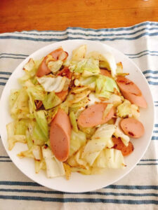 魚肉ソーセージとキャベツをカットし、オリーブオイルをひいたフライパンに入れて炒め、塩胡椒で味を調えたら完成です。