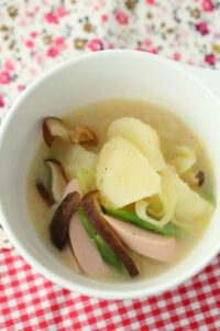 魚肉ソーセージだけではスープの味が物足りなく感じてしまいますが、戻ししいたけを汁ごと入れることで、風味豊かなスープになります。