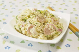 きゅうり、玉葱、フィッシュソーセージ、塩コショーを入れて混ぜ、さらにカロリーオフマヨネーズ、マヨネーズ、無脂肪乳、酢、ねりがらしを混ぜたものをサラダに混ぜて完成です。