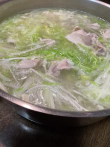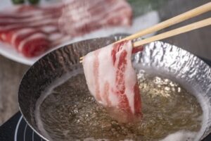 好きなスープを鍋で煮立て、千切りにしたキャベツと白髪ネギを入れ、豚バラ肉をしゃぶしゃぶします。