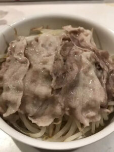 洗ったもやしを耐熱皿に入れ、上に豚肉を乗せてラップをかけます。