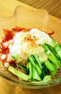 きゅうりやハムは千切りにし、とろろはすりおろしてそばに乗せ、めんつゆをかけて完成です。