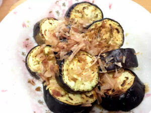 フライパンになすを入れ、両面に焦げ目がつくまで焼いたら皿に盛り、かつお節、★を合わせたもの、お好みで七味唐辛子や柚子胡椒を振って完成です。