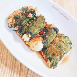 水切りした豆腐、みじん切りにした玉ねぎ、細切りにした大葉(10枚)を混ぜ合わせ、大葉で包んでフライパンで焼き色がつくまで焼いたら蒸し焼きにします。