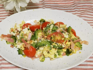 フライパンにオリーブオイルを入れ、ベーコンを炒め、さらにゴーヤを入れて炒め、ゴーヤがしんなりしてきたらトマトを入れて炒めます。