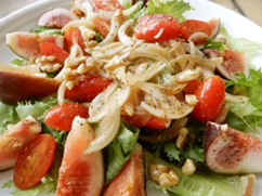 大きな皿にレタスをちぎって並べ、カットしたいちじく、玉ねぎ、ミニトマトを並べ、玉ねぎとミニトマトの残りエキスを回しかけ、クルミ、ブラックソルト、あらびき黒コショウをかけて完成です。