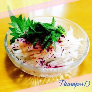 - 千切りか適当にちぎった大葉と、ゆかりを大根にかけて完成です。