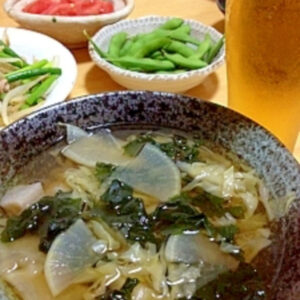 - 野菜がやわらかくなってきたら調味料を入れ、最後にカットわかめを入れて完成です。