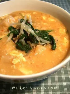 トロミのあるスープに、押し麦のぷちぷちとした食感が癖になる腸が綺麗になるスープです。