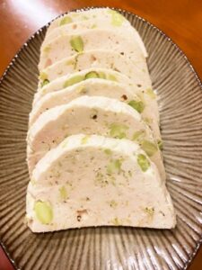• フードプロセッサーでミンチ状にしたささみ肉に枝豆を混ぜ、ラップで包みます。