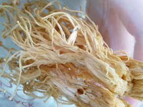 できあがった干しえのきは乾煎りして塩を振るだけでおつまみやおやつになります。
