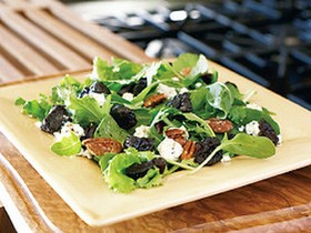 ボールにレタスと、オリーブオイル、酢、エシャレット、塩、こしょうで作ったドレッシングを入れてかき混ぜ、皿に盛った後、プルーンとナッツを散らして完成です。
